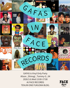 連休のフィナーレは、天神の次世代を担う若きDJクルー「GAFAS」 (Alison, Tommy-G, 64) が担当。オールジャンルで、連休最後のひとときをゆるやかに彩ります。